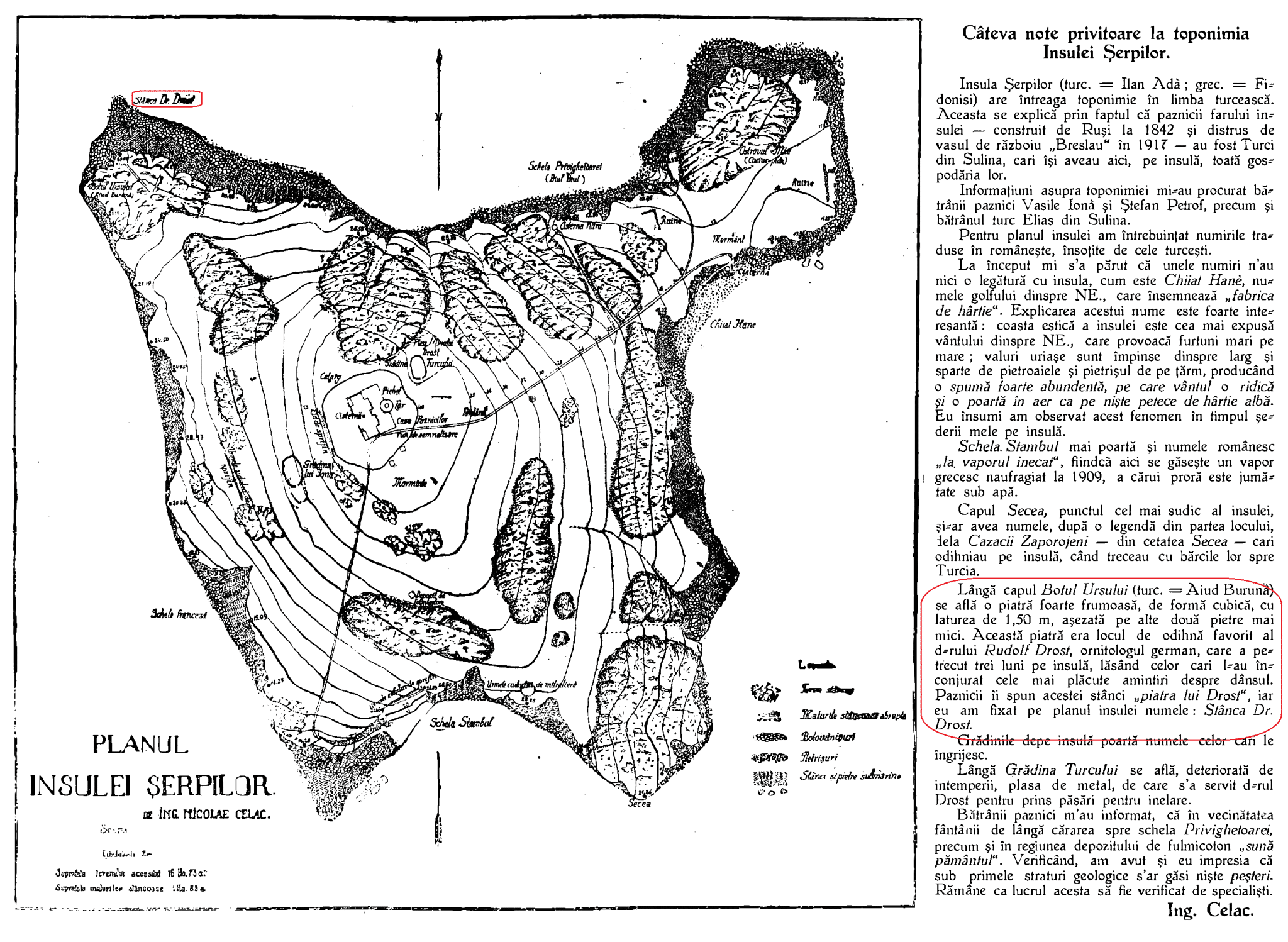 Răposatul Brăneanu a citit un articol, ”Insula Șerpilor. Schiță monografică”, publicat de R.I. Călinescu în ”Analele Dobrogei” 1931, f. 1-12, p. 1-62. Și a găsit acolo o hartă, cu mici considerații marginale, ”Câteva note privitoare la toponimia Insulei Şerpilor”, și harta și considerațiile aparținându-i ing. Nicolae Celac: