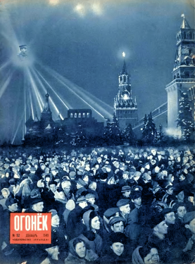 1949. Stalin împlinea o vârstă rotundă, 70 de ani. În Piața Roșie este montat un spectacol grandios. În aer, ”la 1000 de picioare înălțime”, staționează un Stalin uriaș, suspendat de un balon și iluminat de proiectoare, pentru a crea un efect teatral și ”miraculos”. (Огонёк (Ogoniok) nr. 52/1949, coperta. Scena a fost reală; nu este vorba de un fotomontaj.)
