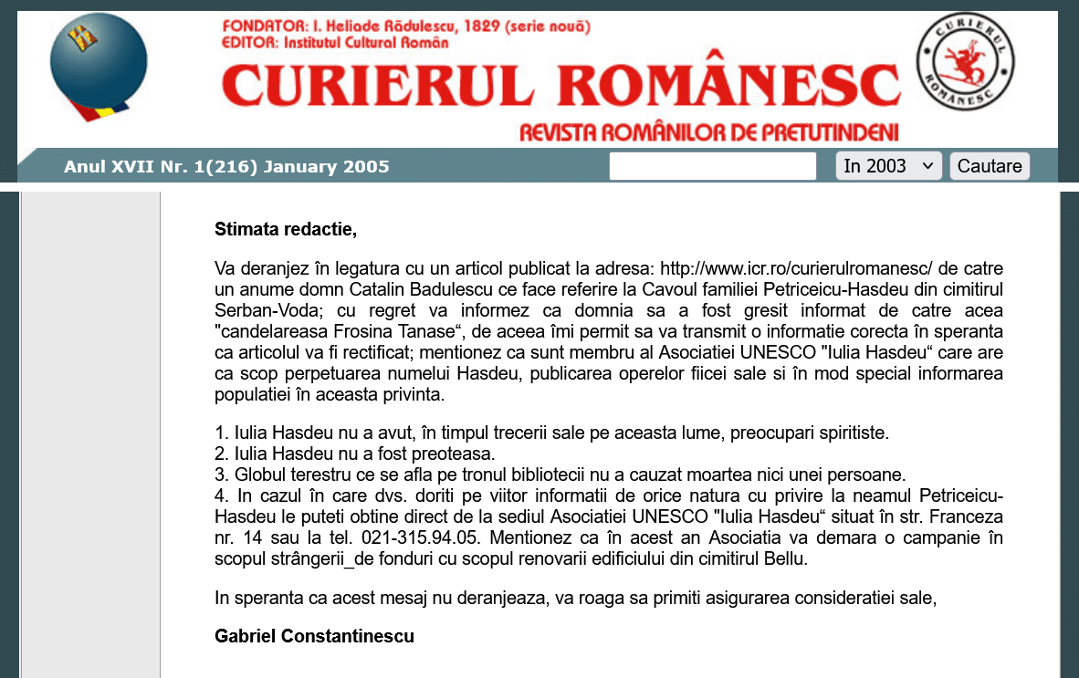 Gabriel Constantinescu (Dumnezeu să-l odihnească în pace!) era pasionat de B.P. Hasdeu şi, pe această linie, de spiritism şi vânătoarea de fantome. Căpătase preocuparea aparent bizară, dar motivată în context, de a fotografia noaptea prin cimitire, sperând să surprindă manifestările ”lumii de dincolo”. Găbiţă observase mulţimea de sfere luminoase, de toate mărimile, surprinse în diverse cavouri, în special la Bellu. Împreună am reuşit să găsim explicaţia ”spiritelor globulare”: fiind vorba de spaţii înguste şi prăfuite, în primă instanţă curentul de aer ridica praful strâns acolo cu anii. La declanşare, lumina blitz-ului de la apartul foto se reflecta în particulele de praf, creând impresia de ORB. Din nou, nimic supranatural, nimic misterios!